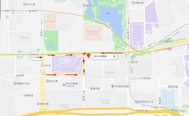 [交通指引]:地铁:1号线、6号线科学馆站D/F口,“9号线红岭南站A出口。