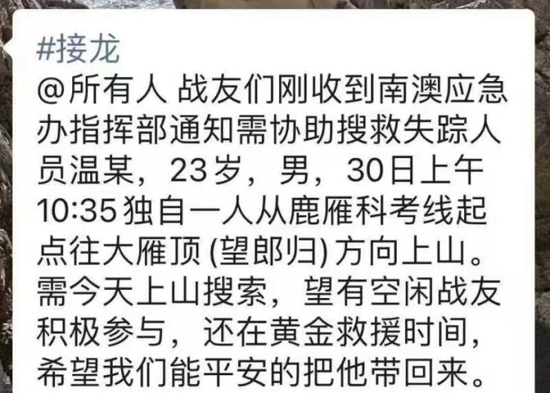 12月2日上游新闻记者看到,上述信息显示11月30日上午,失联人员温某(23岁,男)10:35独自一人从鹿雁科考线起点往大雁顶(望郎归)方向上山失联。