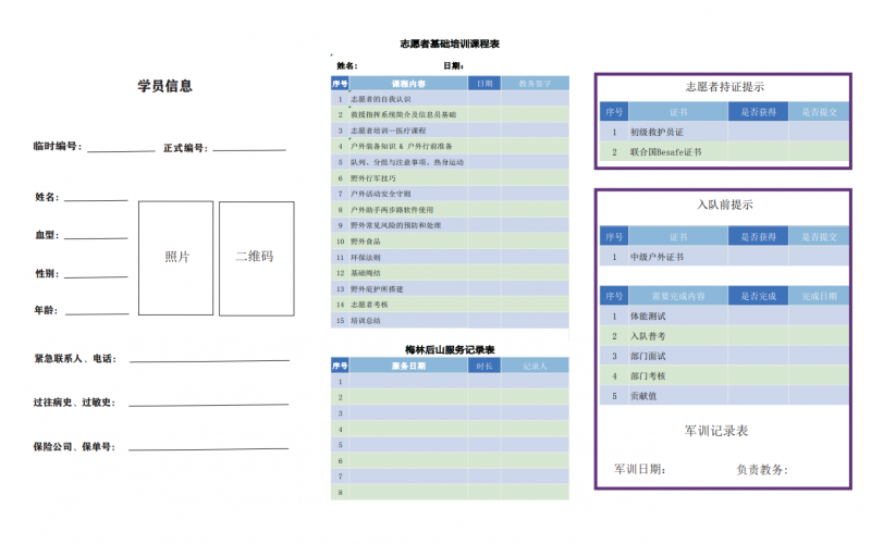 救援志愿者签到卡: 第一次参加培训或者社会服务的时候,每人1张,所有的活动都必须在一张签到卡上有效以后每次活动都参加, 需要领队或教务给大家在上面签字确认参加,